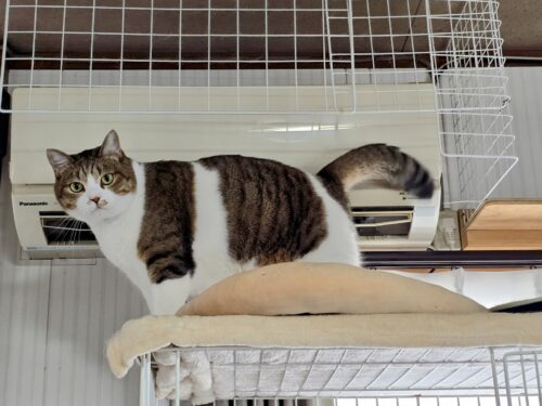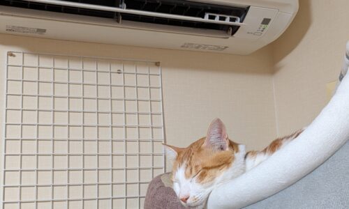 After写真では、新しくなったエアコンの下で猫が心地良さそうに寝ている姿が確認できます。